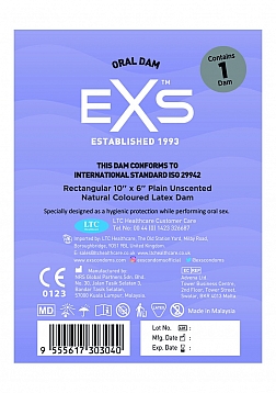 EXS Oral Dams are a great product to use with flavoured lubes for a greater flavourful experience. They are the 1st Oral Dams to be CE Certified and conforms to ISO 29942. Each dam is individually wrapped allowing the dams to be distributed quickly and efificiently. EXS Oral Dams provide a protective barrier when performing oral sex. Made of natural rubber latex, EXS Oral Dams are non-scented.