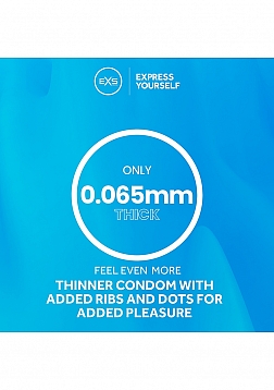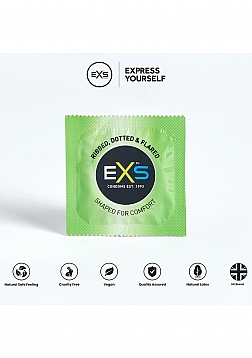 Contains 48 premium latex, EXS Ribbed and Dotted Condoms. EXS Ribbed and Dotted Condoms are an excellent choice for lovers who want an intimate and sensual experience. Designed with your partner in mind, these condoms enhance internal stimulation for a quicker and more powerful vaginal climax.