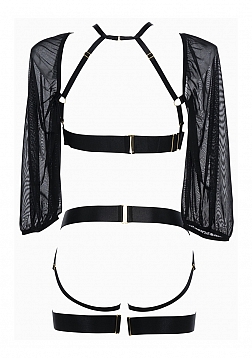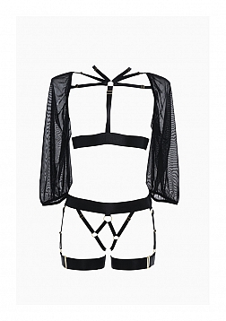 Ibiza Babe is a wild & deliciously beguiling take on sexy. If you are a jet setter or simply a Femme Fatale, this set will make you look & feel incredibly gorgeous. Strappy open front bodice with attached mesh sleeves.  Adjustable straps throughout. Fully open panty with adjustable straps and attached garters with leg bands. To garter or not is never a questionÂ…xo