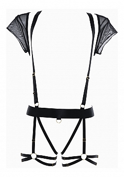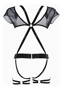 For the fashionista meets seductress look. Definitely not for Zoom, this one is in person only. Attached mesh bolero top with adjustable front and back suspender straps melt into a fully open panty with adjustable straps.  To sweeten the look even more, garter straps highlight the hips with attached adjustable leg bands.