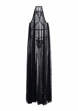 If undressing is an artÂ…then this piece is a masterpiece. This shoulder baring sheer mesh cape is absolutely divine with adjustable criss-cross body straps to contour and highlight your best assets. Definitely a must have for effortless boudoir dressing. Comes with an open front G-string.