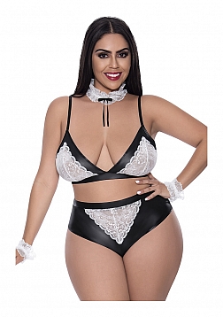 From the Dress Up collection by Magic Silk, this style includes: a black and white bralette featuring adjustable shoulder straps with silver tone sliders and hook & eye closures in the back, a lace collar with a black satin bow, lace wrist cuffs, and a matching panty.