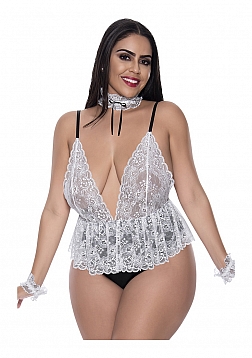 From the Dress Up collection by Magic Silk, this style includes: a lace teddy featuring a deep v neck and low back, adjustable shoulder straps with silver tone sliders, a lace collar with a black satin bow, and lace wrist cuffs.