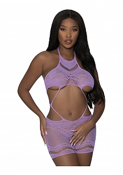 From the Seamless collection by Magic Silk, this style includes: a crotchless mid-thigh length romper featuring a high neck design, fishnet and lace fabric details and large cut-out accents in the front and back. This stretchy style can conform to any body type and is extremely flattering!