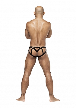 From the Galactic collection by Male Power, the Strappy Ring Jock features plush elastic strapping attached to two metal rings in rear, a comfort contoured pouch front and an ultra plush tone on tone embossed waistband.