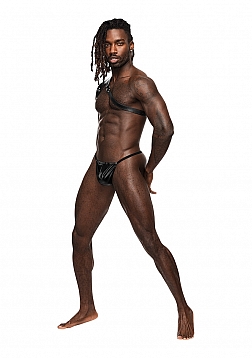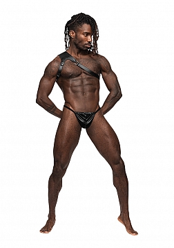From the Leather collection by Male Power, this style includes a one shouler harness with adjustable strapping, metal buckels, rings and studs.