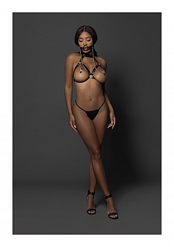 From the women's Leather collection, this style includes an open halter bra with adjustable buckled back and neck choker and a separate adjustable buckled ball clamp mouthpiece with metal nipple clamps, metal rings and studs.