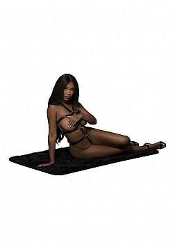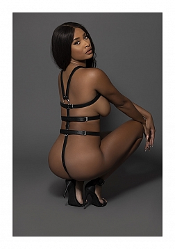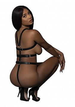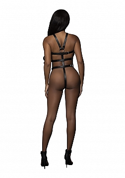 From the women's Leather collection, this style includes a full torso restraint harness with adjustable buckled back straps and adjustable t-back with metal rings and studs.
