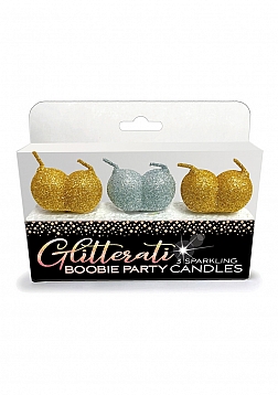 Glitterati Boobie Candle Set contains 3 pairs of gold and silver boobies. These fun and flirty candles are a an elegant addition to your next boobie themed party.