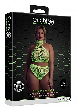 Unleash your inner goddess with this stunning UV activated lingerie. This piece consist of a turtle neck crop top and high waist panty. An amazing party-wear that gives you that wow-factor and makes you stand out. The UV activated materials adds a touch of mystery and allure. Easy to fit because of the stretchy materials will make you light up the night.