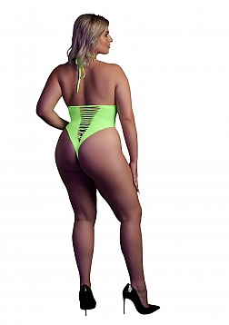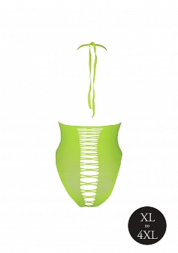 Unleash your inner goddess with this stunning UV activated lingerie. This gorgeous body has a show stopping easy to tie halterneck and a high cut creating the illusion of a smaller waist and rounder hips. The open croutch gives it a little extra playfulness. An amazing party-wear that gives you that wow-factor and makes you stand out. The UV activated materials adds a touch of mystery and allure. Easy to fit because of the stretchy materials will make you light up the night. Available in neon pink and neon green. Sizes run from XS/ XL to XL/XXXXL