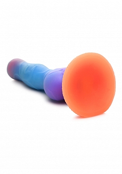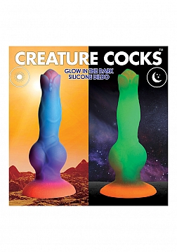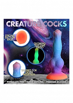 Take your fantasy roleplay, kinky cosplay or creative roleplay further with tangible fantasy toys from Creature Cocks! This Glow-In-The-Dark Alien Dildo might just be the perfect space canine for your carnal pleasures! With a bulging knot at the base, veins popping out along the shaft and a foreskin that has triple beads along the edge, it's also intensely colorful! The psychedelic colors start with the sunburst of reddish orange at the base and continue into purple and blue along the shaft! Embedded in the silicone mold is glitter that shines even more cosmically when the dildo is exposed to sunlight or UV light so that it glows! The wide base provides powerful suction so you can go hands-free by placing it on any flat surface to keep it in place. You can also combine it with a compatible strapon harness for pegging play! Made out of premium, phthalate-free silicone, it has a firm core and soft, silky surface. Use only with water-based lubricants for best results. After play is over, wash the dildo with warm water and soap and use a toy cleaner to spray clean. Wipe dry and store in a cool, dark place out of direct sunlight.