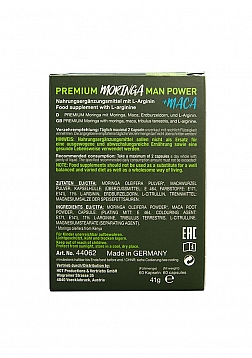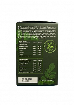 | Dimensions package | 6,70 x 6,10 x 9,20 cm | | Weight package | 74 gram | | Product dimensions | 5,1 x 5,1 x 8 cm | | Product weight | 60 gram | | Product diameter | 5,1 cm | | Ingredients | INGREDIENTS EU/CTFA: MORINGA OLEIFERA POWDER*, MACA ROOT POWDER, CAPSULE: (PLATING MITT: E 464, COLOURING AGENT: E171, E141), 11% L-ARGININE, TRIBULUS TERRESTRIS, L-CITRULLINE, MAGNESIUMSTEARATE (SEPARATING AGENT). |