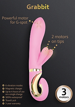 Gvibe has reimagined one of the most popular vibrator models. Grabbit has ears, and it has not 2 motors, but as many as 3! Why is this needed? Not all women enjoy direct stimulation of the clitoral head. Some women, during orgasm, get an unpleasant feeling that caresses are too strong, and touching the clitoris is unpleasant. But if you caress the clitoris on the sides, then the stimulation is more gentle, and in combination with the powerful vibration of the vaginal part of the device, you are guaranteed a deep, long orgasm.