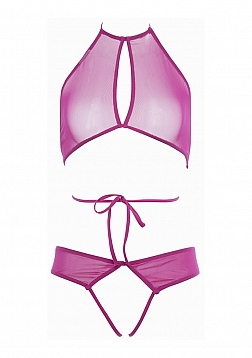 This set is mix of Sporty & Spice, with the classic halter barely covering your assets and circling the under bust & waist for maximum drama. Fully open panty with strappy lace up back. What more could you dream of?