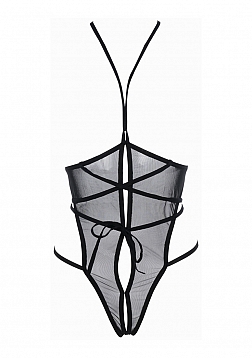 You can save other things for a rainy dayÂ…this teddy should definitely not be one of those things. Nicola open cup mesh teddy is that visual aphrodisiac that ever so lightly wraps your body, with skinny sexy straps. Neck straps loop around neck and body tying in back. Front straps wrap around the body and tie in front. Elastic G-string back.