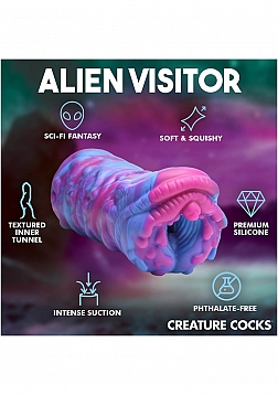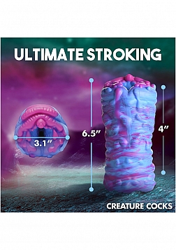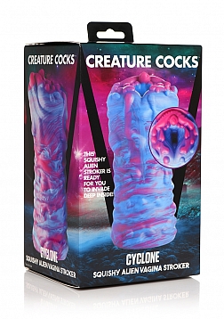 This extraterrestrial, squishy Cyclone Alien Stroker is out of this world! The thick, flexible, premium silicone is phthalate-free and silky smooth. Push yourself inside and penetrate the textured tunnel of this erotic alien orifice! Enjoy the vibrant color and gushy, wet look as you grip it and stroke away! Use only with water-based lubricants. To clean, use warm water and mild soap, then spray with a toy cleaner and let dry.