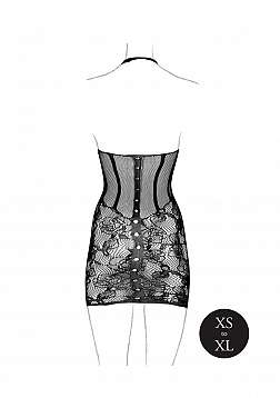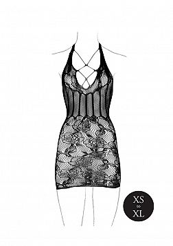 Halterneck dress with a waist-cinching corset look. The lace pattern and fishnet detailing add an extra dose of sexy. The soft super stretchy fabric will fit sizes XS to XL.