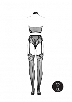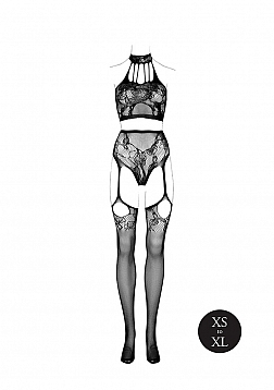 Halter turtleneck two-piece with pantie and attached stockings. Stunning combo of lace pattern and fishnet, accentuating the body. The soft super stretchy fabric will fit sizes XS to XL.