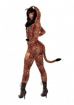 Tiger printed brushed spandex jumpsuit featuring an attached hood with plush trim lining & a detachable tail.