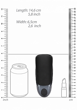 | Dimensions package | 9,20 x 9,20 x 20,50 cm | | Weight package | 372 gram | | Product dimensions | 14,6 x 6,5 x 5,7 cm | | Product weight | 280 gram | | Inner diameter | 4,8 cm | | Insertable length | 7,5 cm | | Quantity motors | 1 | | Rotations per minute | 11000 RPM | | Speed modes | 10 | | Multi speed | Yes | | Noise level | 60 dB | | Rechargeable | Yes | | Rechargeable time | 240 min | | Recharged battery lifetime | 60 min | | Waterproof | Yes | | Splashproof | Yes | | Phthalate free | Yes | | Materials | Silicone, ABS |