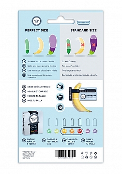 The practical size kit contains the Condom Sizer, which you can use like a calliper. Pull it apart and place it centrally around the erect penis. Now you can read off your recommended size from the arrow. It also contains 3 condoms in 3 different sizes to test your condom size immediately.