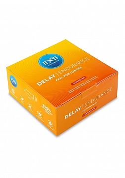 Natural latex, teat ended, and silicone lubricated condom. EXS Endurance Delay condoms are 53 mm straight walled and made of natural latex. Each condom is lubricated on the outside (although extra lube maybe required) and have a 1% Lidocaine anaesthetic lube on the inside which should be massaged into the head of the penis. EXS Endurance Delay condoms make you last longer during love making!