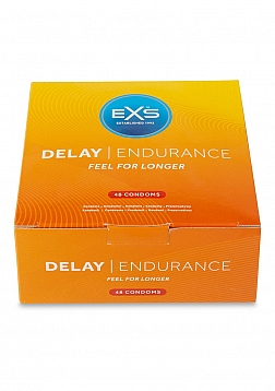 Natural latex, teat ended, and silicone lubricated condom. EXS Endurance Delay condoms are 53 mm straight walled and made of natural latex. Each condom is lubricated on the outside (although extra lube maybe required) and have a 1% Lidocaine anaesthetic lube on the inside which should be massaged into the head of the penis. EXS Endurance Delay condoms make you last longer during love making!