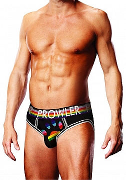 Feel confident, sexy, and ready to prowl with this Prowler open-back brief that is sure to turn heads. This style is made for the guy who wants to strut his stuff wherever he goes. Made from soft blend of polyester and spandex, this brief comes in black (so they'll match everything), with Prowler's signature paw print logo drawing attention to your package. Plus, it's in the colors of the Progress Pride flag colors so you'll be proudly celebrating anywhere you go.