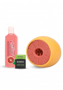 Get all the fun of the grapefruit experience without a trip to the grocery store! This adorable open-ended stroker has a tight, textured interior made from ULTRASKYN, for the ultimate feel. It includes a 1 oz bottle of Grapefruit-flavored GoodHead Slick Head and ULTRASKYN Refresh Powder to keep it ripe and ready.