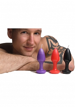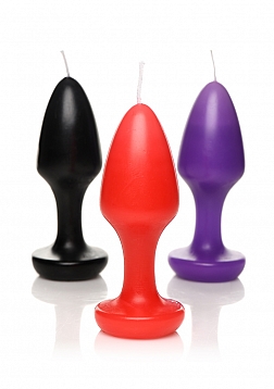 Bring some seductive sensory play into your evening with wax play! Use these fun and suggestive butt plug shaped candles and enjoy watching them melt down and drip for you! With a low melting point, you can easily get them dripping and use them to stimulate and decorate your partner's body with colorful wax! As a bonus, the paraffin wax is also moisturizing so it helps soothe and smooth your partner's skin as it is getting stimulated and heated up! Use a scraping device (such as a plastic card) to scrape the wax off their body when done, or spank it off their spankable areas to have fun during removal! Make sure to keep the candle away from any flammable materials.