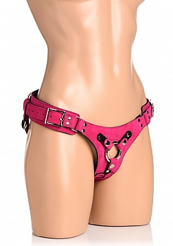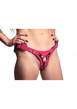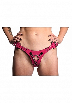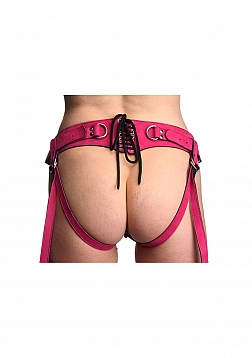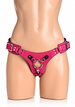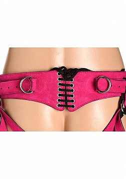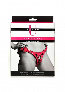 Peg your partner in style with this deluxe leather corset harness! Vibrantly colored, it is also beautiful, flattering to your figure, and comfortable to wear! Made out of leather, the outside is brushed so it is soft. It's durable, long-lasting and forms to your body the more you wear it. Adjust the straps around the thighs and hips using the nickel-free, metal buckles. Adjust the back with stylish, corset-style closure that has nylon laces. Along the inside is a soft lining that reduces chafing and makes wearing it more comfortable for long scenes. At the front is a metal o-ring. Spot clean as needed.