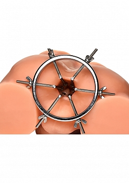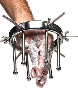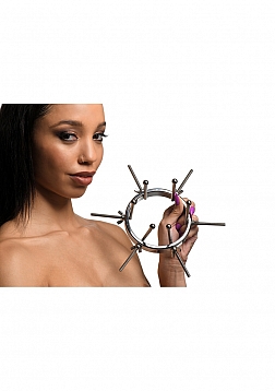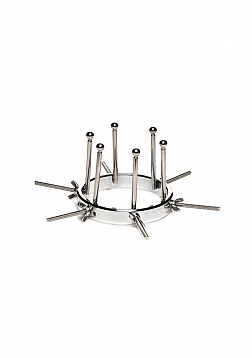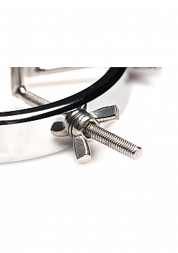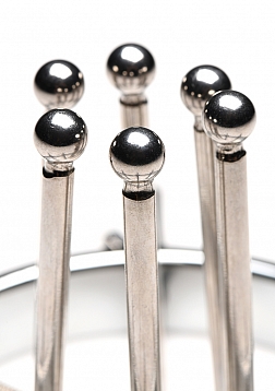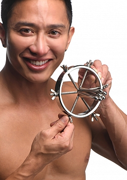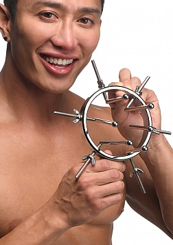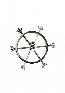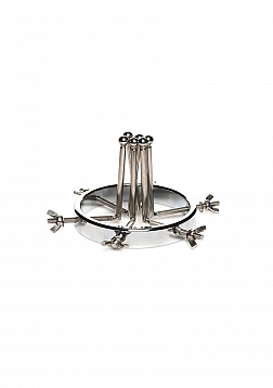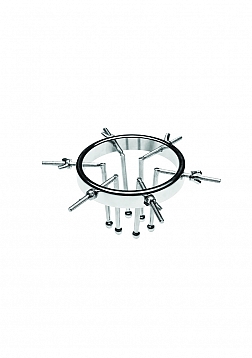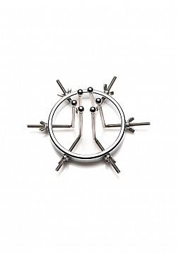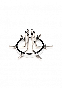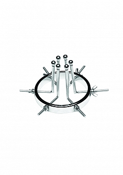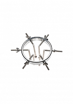 This stainless steel anal explorer is perfect for those into medical play who want to expand and stretch open their backdoor! Made out of strong, durable, non-porous, nickel-free steel, it's compatible with all lubricant types and is nonporous. The Anal Explorer consists of one large ring with a diameter of 4.1 inches and 6 dilators that have smooth rods with small, round, balls on the ends of them. Insert it almost 3 inches deep and spread their hole wide open! The ring is wide enough for you to fit your fist through, as well! Each dilator rod can be adjusted individually using the wingnuts to tighten or loosen the position on the screw. Only the smooth steel will be pressing against the sensitive tissue of the anus while the spiraling screws are outside against the buttocks. To clean after use, rinse with warm water and mild soap or boil it in water. Then spray it with isopropyl alcohol and wipe clean.