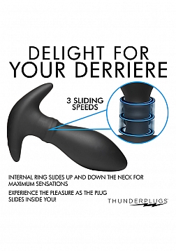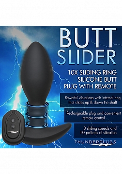 Give yourself a special treat with this sliding plug that rims your rear entry while buzzing your booty! Made out of premium quality silicone, it is soft, smooth and phthalate-free for body-safe, worry-free fun! Inside of the toy is a motor that has both sliding and vibrating features. Choose between 7 sliding speeds and 7 vibrating patterns that you control with a rechargeable remote control! The sliding functions focus on the sphincter and simulate an intense rim job and feel like getting penetrated with the tip again and again! Designed to withstand wet environments, it's rated as IPX5 waterproof so it can handle low pressure water jets and lots of lubricant. Use water-based lubricant for best results. The tapered tip makes this plug easy to insert for those new and experienced to anal play. The slim, flared base makes this toy safe and allows you hours of secure comfort! Use the USB cable provided to recharge the plug or remote as needed. To clean, use warm water and mild soap, then rinse and spray with a toy cleaner before patting dry and storing in a cool, dark place.