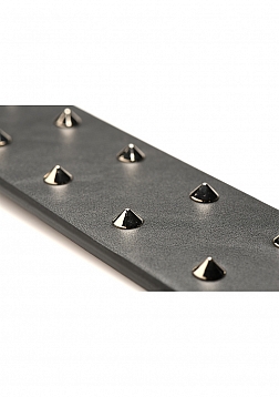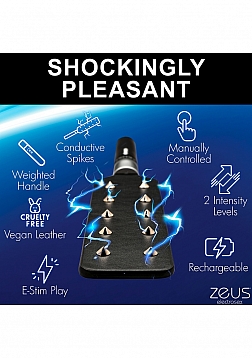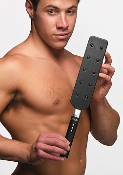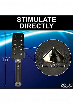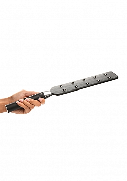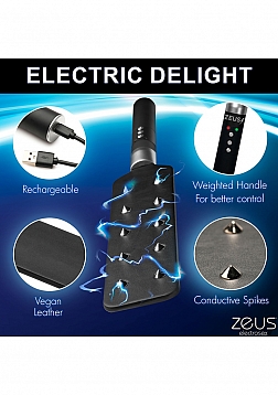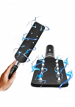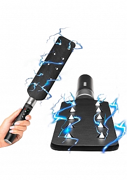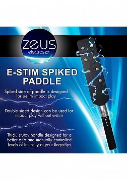 Materials: PU leather, ABS plastic, zinc alloy Color: Black Note: Keep away from water. Not recommended to use e-stim products on the chest or with partners who have pacemakers. Key Features: E-Stim Spikes: The electricity runs through every one of the conductive metal spikes so each hit has an extra shock! Flat Side of Paddle: Enjoy using the flat side of the paddle, as well. It's covered in vegan-friendly, faux (PU) leather. Two Levels of Stimulation: Choose between high or low intensity. Rechargeable and Nickel-Free: Use the USB cable to recharge between uses. All metal is nickel-free and body-safe.