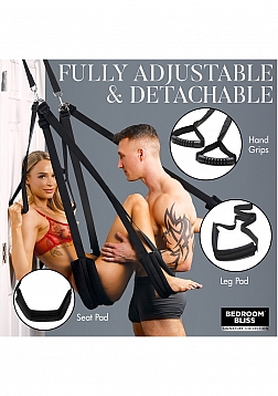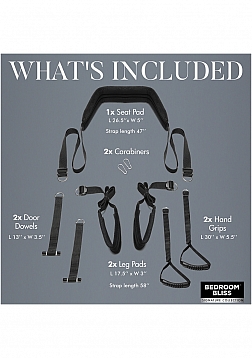 Key Features: Easy to Set Up: Easily hook it over a doorframe or clip it into a sex swing stand. Adjustable Straps: The seat pads, thighs pads and hand grips are all adjustable for a custom, comfortable position. Strong and Durable: This durable nylon can handle up to 300 lbs of weight so you can feel safe and secure while suspended. Padded for Comfort: The straps are padded around the seat area and thighs so you can relax and enjoy the ride without nylon biting into your skin!