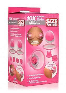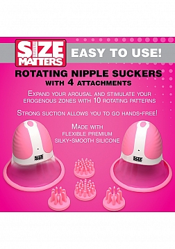Key Features: Suction Grip: The cups hold on via suction. Press the sides to create a suction and release to hold it in place. Rotating Nipple Stimulators: Enjoy stimulating soft nubs as they rotate on your nipples! Two Sets of Attachments: Choose between the nubs that rub against the top of your nipple or the ones that rotate around the nipple and stimulate the areola. Premium Silicone: Made out of premium silicone. It's phthalate-free, silky smooth, and very flexible. Rated IPX5 splashproof, too!