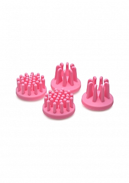 Squeeze the silicone grips on the sides of the sucker and place the sucker over the nipple. Once the sucker is in position, release the silicone grips to create suction to hold the sucker in place. Press and hold the button on top of the sucker for 3 seconds to power rotation on/off. Press repeatedly to cycle through 10 rotating patterns. To swap out the silicone attachments, firmly grasp the attachment and pull while wiggling it back and forth. Attachment will pop out and the new attachment can be pressed into place.