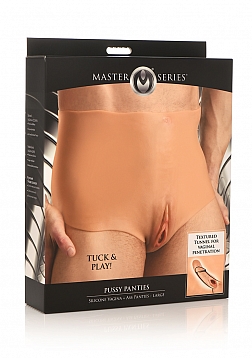 With silicone pussy panties you can play with your gender, live out a fantasy, try something new, or enjoy a tool that helps with gender dysphoria. Built for those born with male genitalia, it is designed to be worn by tucking the penis and testicles between the thighs and out of the way and then slipping on the pussy panties. Enjoy looking down and seeing a beautiful vulva with a vaginal opening that your partner and you can enjoy! The soft, stretchy, textured vaginal canal is covered in little, grippy nubs that massage and stimulate your partner's shaft as they penetrate you. Enjoy deeper, intimate connection as you embrace your feminine side! Want to enjoy penetration from behind? The panties have a small anal hole in the back so you can enjoy anal penetration without taking the panties off. Whether you've just been curious about what it would look and feel like to have a vulva, or if you feel the most intimate and authentic when you can see a pussy instead of a penis on your body, these pussy panties are here to give you unique, sexy and affirming experiences!