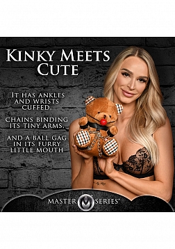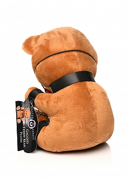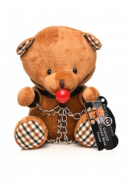 Give this gagged bear as a gag gift or keep it for yourself! It's just big enough to cuddle but doesn't take up too much space! Add it to your collection for Littles to play with, give it to your submissive during aftercare, or keep it with your pillows! With a collar, wrist and ankle cuffs and nickel-free chains connecting them, this little bear is restrained for your pleasure and amusement! Made out of polyester, PU faux leather, plastic and nickel-free metal.