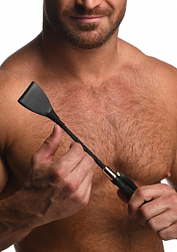 Add a sturdy crop to your collection and always have a wicked tool on hand for spankings and kinky play! This riding crop delivers a sharp and certain bite for when you want to kiss your partner with a touch of delightful pain. Made out of vegan friendly leather, this crop has a textured grip that helps you keep your grip as you play. The firm rod at the center is made of a glass fiber that is firm with enough flex to handle impact. The triangular end is perfect or precise and specific impact play. To clean, spray with a toy cleaner or a mixture of alcohol and water. Bend them over after some teasing and negotiation. Warm up their behind with a few spankings and floggings. When they're ready, start to tap them lightly with the triangle end of the crop. Each impact is precise and stings ever so slightly. Begin to go harder and harder, their skin flushing red, until they've had enough. Rub the spots where you hit them, then continue again when they're ready for more!