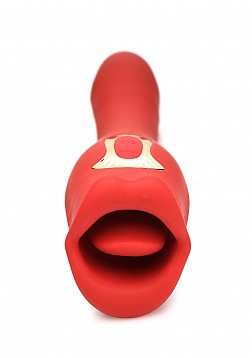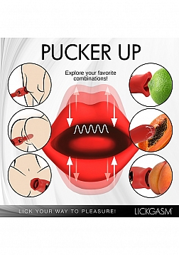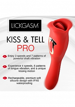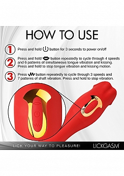 Your deepest kisses await. Satisfy your desires with this dual-ended kissing vibrator! The luscious red Lickgasm has a flexible, vibrating shaft and a kissing, licking mouth. Enjoy 3 speeds and 7 patterns of vibration throughout the shaft and use it to penetrate yourself as much as you crave. Warm up with countless kisses as the kissing tongue gives you 4 speeds and 6 patterns of simultaneous kissing and vibration. Your precious pearl will thank you as the smooth, premium, phthalate-free silicone brushes against your lips for intimate play. Rated as IPX6 waterproof you can take it in the shower but do not submerge it under water. After play, wash with warm water and mild soap, then spray with a toy cleaner and let dry.