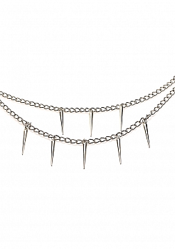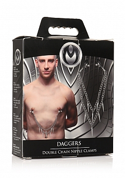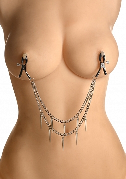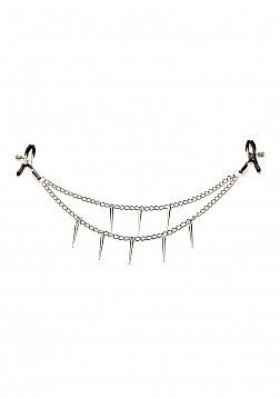 Color: Black, silver. Key Features: Spiked Chain: Two rows of chain hang down between the nipples and have spikes dangling from them. Enjoy the aesthetic and look as well as the ability to gently tug at the clamps! Adjustable Clamps: Use the screw to adjust for perfect pressure and position. Rubber Coated Tips: Protect the sensitive skin of the nipple and areola with the rubber tipped ends. Nickel-Free Metal: All metal is nickel-free for sensitive bodies.
