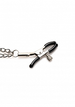 Pleasure, pain and aesthetic appeal all in one: these nipple clamps are the perfect way to adorn yourself and give an extra kinky twist to a classic toy. The metal chain has spikes that hang from double chains. As they are suspended across your chest, the clamps grip tightly to your sensitive nipples. With rubber tips to protect the delicate skin of the nipple and areola, the clamps are also easy to use and use a screw to adjust the pressure. Not only do the spiked chains look beautiful, they can also be used to gently tug at the nipple clamps and play with sensations further! After use, simply spray them with a toy cleaner and then let them dry. All metal is nickel-free.
