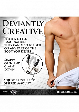 Take one clamp in one hand and grab the nipple in the other hand. Place the clamp right below the nipple along the areola. As you clamp down, adjust using the screw and move slowly. Apply pressure very slowly and release slowly. Every little movement will cause some amount of sensation or pain, so be intentional. Keep it on for no longer than 30 minutes the first few times. As you remove them, keep in mind that removal can be twice as intense as application! Enjoy!