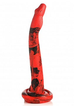 Key Features: Fantasy Dildo: Indulge in your fantasies with this red and clack, scaled, serpent anal hose! The tapered nose, wide flared neck, and long, flexible body is perfect for exploring your darkest caverns. Flexible Premium Silicone: Made out of premium, phthalate-free, body-safe silicone. It is flexible and best used with water-based lubricants. Harness Compatible: Use with a strapon harness for pegging play or couple's roleplay! Suction Cup Base: The suction-cup base lets you enjoy a hands-free ride!