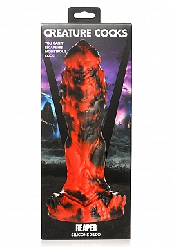 The Reaper comes for more than just your soul! It comes for your hole, too! This red and black dildo is menacingly large with textured ridges, nubs, grooves and spikes on it. The edge of the corona is rimmed with spiked nubs and is wider at the top then the middle. Made out of premium, flexible, phthalate-free silicone, this dong is body-safe and best used with water-based lubricants only. Enjoy hands free rides due to the strong suction cup base! Invite a partner to indulge in kinky cosplay or fantasy roleplay and use their favorite harness to transform this dong into a strapon! Afterward, make sure to wash it with warm water and mild soap, then spray it with a toy cleaner and air-dry. Keep out of direct sunlight and heat.