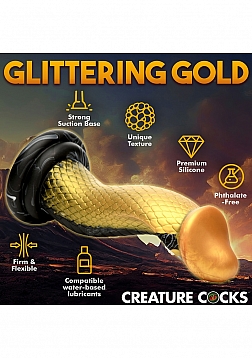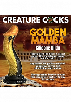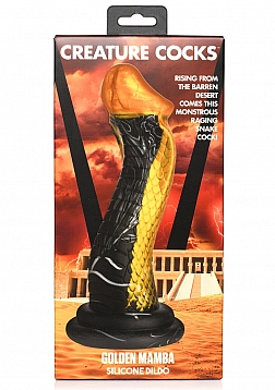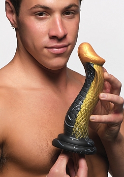 The royal king of cobras, the Golden Snake of your dreams has arrived! The brilliant, shining gold and black body has an exaggerated S-curve that will hit your G-spot or P-spot. The wide hood at the top stretches you open and adds extra, soft and scaly texture while the round, dong-shaped head slides easily inside. Made out of premium, flexible, phthalate-free silicone, this dong is body-safe and best used with water-based lubricants only. Enjoy hands free rides due to the strong suction cup base! Invite a partner to indulge in kinky cosplay or fantasy roleplay and use their favorite harness to transform this dong into a strapon! Afterward, make sure to wash it with warm water and mild soap, then spray it with a toy cleaner and air-dry. Keep out of direct sunlight and heat. In the dim firelight you catch the glinting shimmer of gold. It's known that there are snakes in these parts, but you had to find shelter somehow in the warm desert. This cave was perfect to shelter you for the night so you built a fire and watched the light while it sparked to life. As you listen to the crackles, you hear a soft scraping across the dusty floor and catch sight of something gold. A snake rises up, brilliant and large, swaying slightly. It seems hypnotized by the firelight! That's when you notice that, besides its large size, it has a peculiar shaped head! It's almost as if