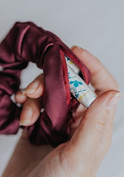 A soft and elegant scrunchie. The fabric strap can be used to secure your ponytail or bun. Also lovely to use as a bracelet.This scrunchie has a secret pocket, to take your essential with you during your period.
